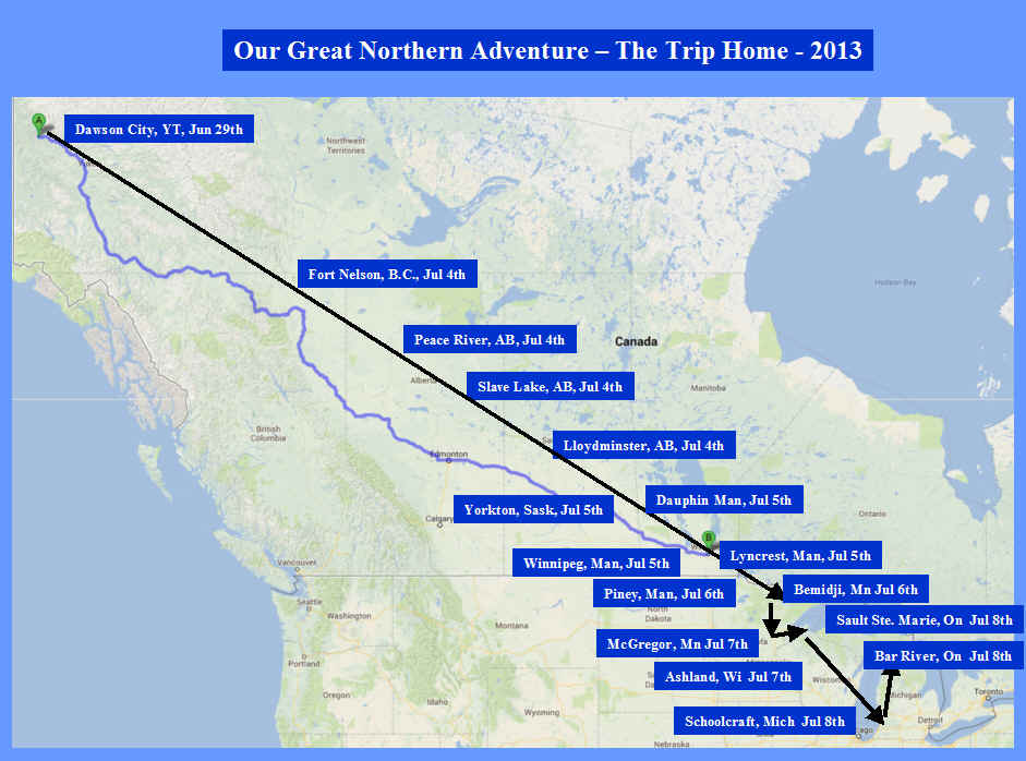 The trip home from Dawson City was pretty direct, but our team encountered some difficult weather conditions. As of Monday, July 8, 2013, Jim and Tom had made it back to Bar River just outside of Sault Ste. Marie Ontario. Because of the horrid weather in Toronto on July 8, it was not possible for them to make it home on Monday as planned.