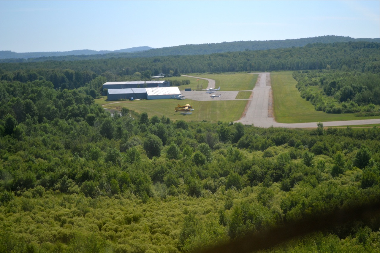 Stopping to clear US customs. You can see the border cut from the bottom right, through the runway and off to the east. Canadian Customs is on the left and US on the right.