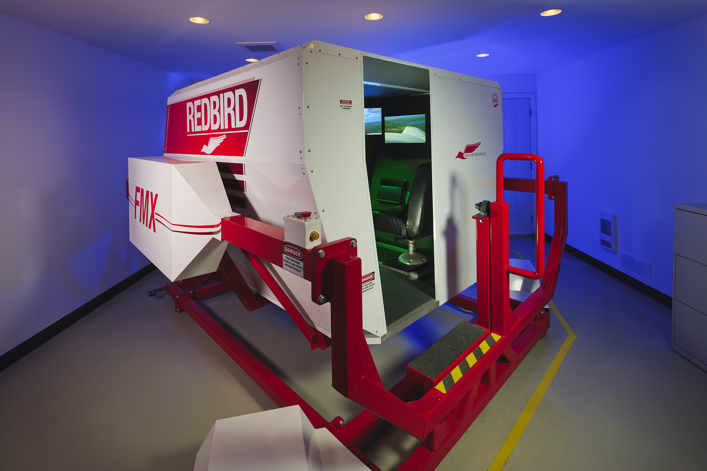 The simulator is a Redbird FMX with software and graphics added to simulate the marine environment.