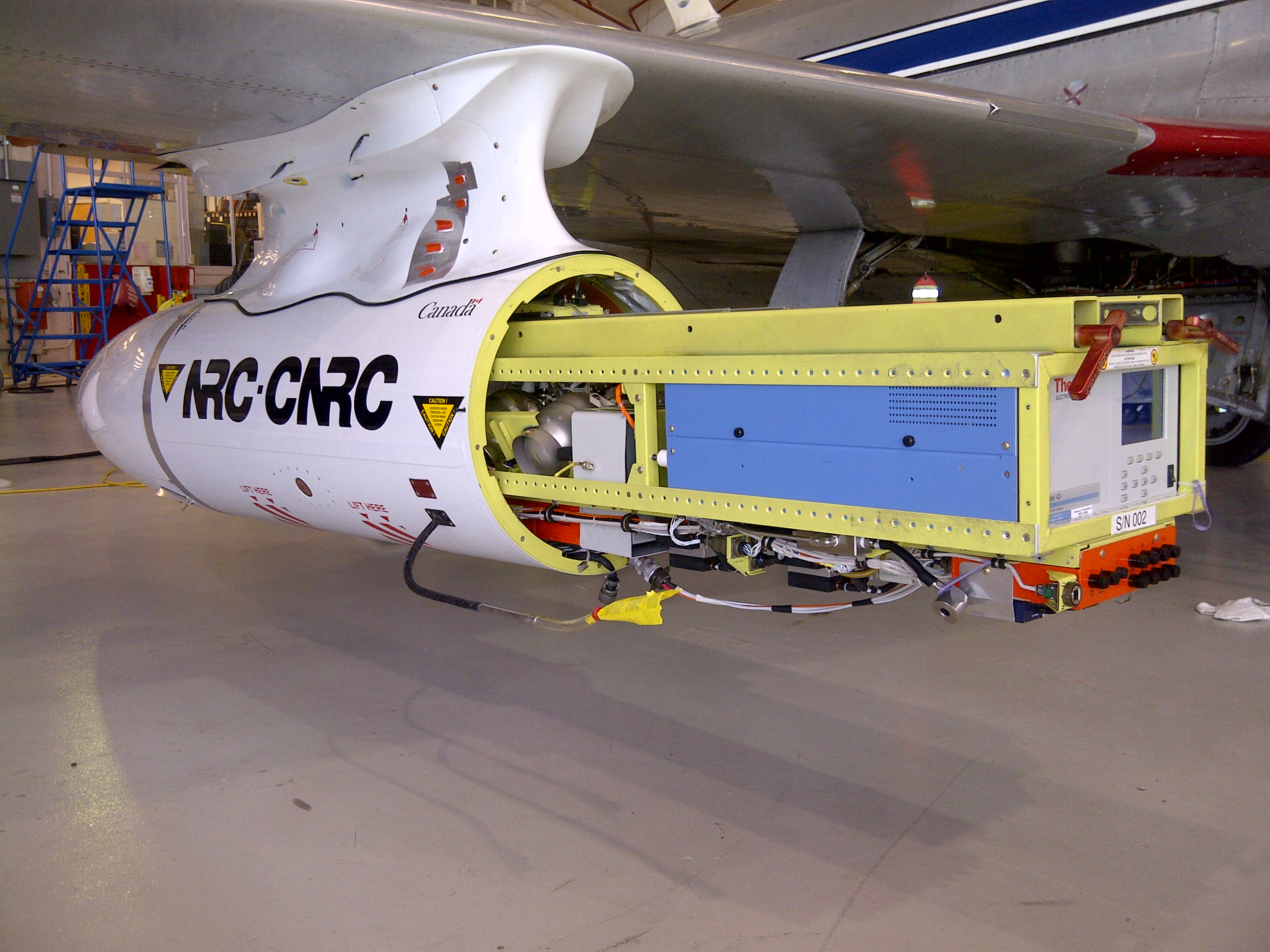 It carries an underwing pod that inhales the exhaust and stores it for analysis. “This important research will aid in the qualification and ready acceptance of the use of biofuels in aviation and open the door to future collaborations on alternative fuels tests,” said an NRC press release.
