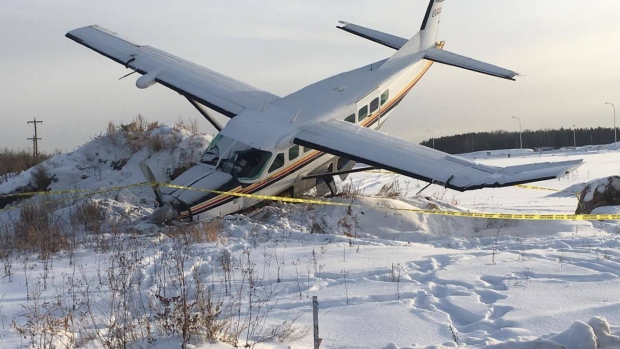 The plane was on a flight from Camrose to Fort McMurray and the pilot reported engine trouble. The CBC is reporting he initially tried to set the aircraft down on a highway but it was too busy. He ended up in a clear area between the highway and the runway after clearing some power lines and a berm.